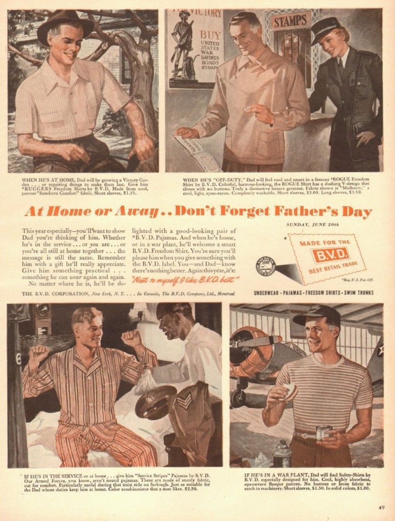 Pour les hommes comme pour les femmes, économiser du tissu est un geste patriotique. La guerre a donc, indirectement, amené à dénuder les corps. Cette tendance a entraîné, également, une plus grande attention portée à l’hygiène de vie personnelle (et ce d’autant plus que les régimes concurrents, qu’il s’agisse du communisme ou des fascismes, exaltent la beauté des corps musclés et sains). L’Américain moyen, même quand il ne prend pas part à l’effort de guerre, prend donc désormais davantage soin de sa personne qu’auparavant. De plus, les pénuries touchant également les parfums (dont beaucoup étaient importés d’Europe), l’hygiène corporelle est devenue plus importante que jadis. On se lave désormais presque tous les jours et pour les hommes, le rasage de frais est une obligation : la barbe est rare, pour qui n’est pas bûcheron ou cow boy, et quand elle existe, elle doit être fournie et broussailleuse, car le bouc est fasciste (associé à Italo Balbo, un des ministres de Mussolini) et la moustache est soit hitlérienne, soit stalinienne, soit encore mexicaine : dans les trois cas, inacceptables pour un Blanc patriote de la bonne société.