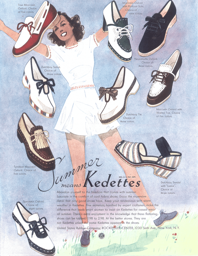 Petite anecdote concernant les bas nylon et leur pénurie durant la guerre puisque le nylon est désormais employé à confectionner des parachutes et autres équipements militaires ; les femmes assistent impuissantes à une pénurie générale de bas nylon. Certaines stars hollywoodiennes telles que Betty Grable vont même jusqu’à vendre aux enchères, à des sommes colossales, leurs propres bas nylon afin de reverser les bénéfices récoltés et soutenir l’effort de guerre. Mais pour nos Américaines, la crise du bas nylon est difficile à endurer. Heureusement, les femmes ont de la ressource et choisissent l’option trompe-l’œil : dessiner le long de la jambe, à l’aide de crayons à maquillage, la fameuse couture, et se frottent la jambe – désormais épilée- avec du thé pour les faire brunir. Ni vu ni connu, j’t’embrouille !